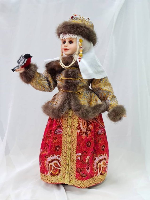 -Наталия Бонченко создала авторскую куклу в боярском зимнем костюме и дополнила образ маленьким снегирем - символом русской зимы и снега.