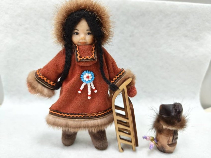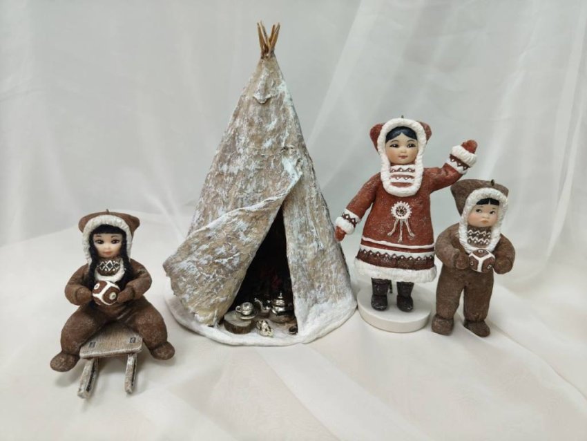 -Ирина Денисова представит на выставке сувенирную миниатюрную куклу - «Корячка Ивнэ с нартами» и композицию кукол из ваты «Корякская семья».
